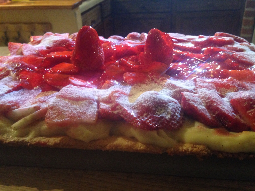 I made a pastry cream, spread the strawberries that I cut in slices because they were really big, made a topping that I colored, deposit two big strawberries for the Deco,